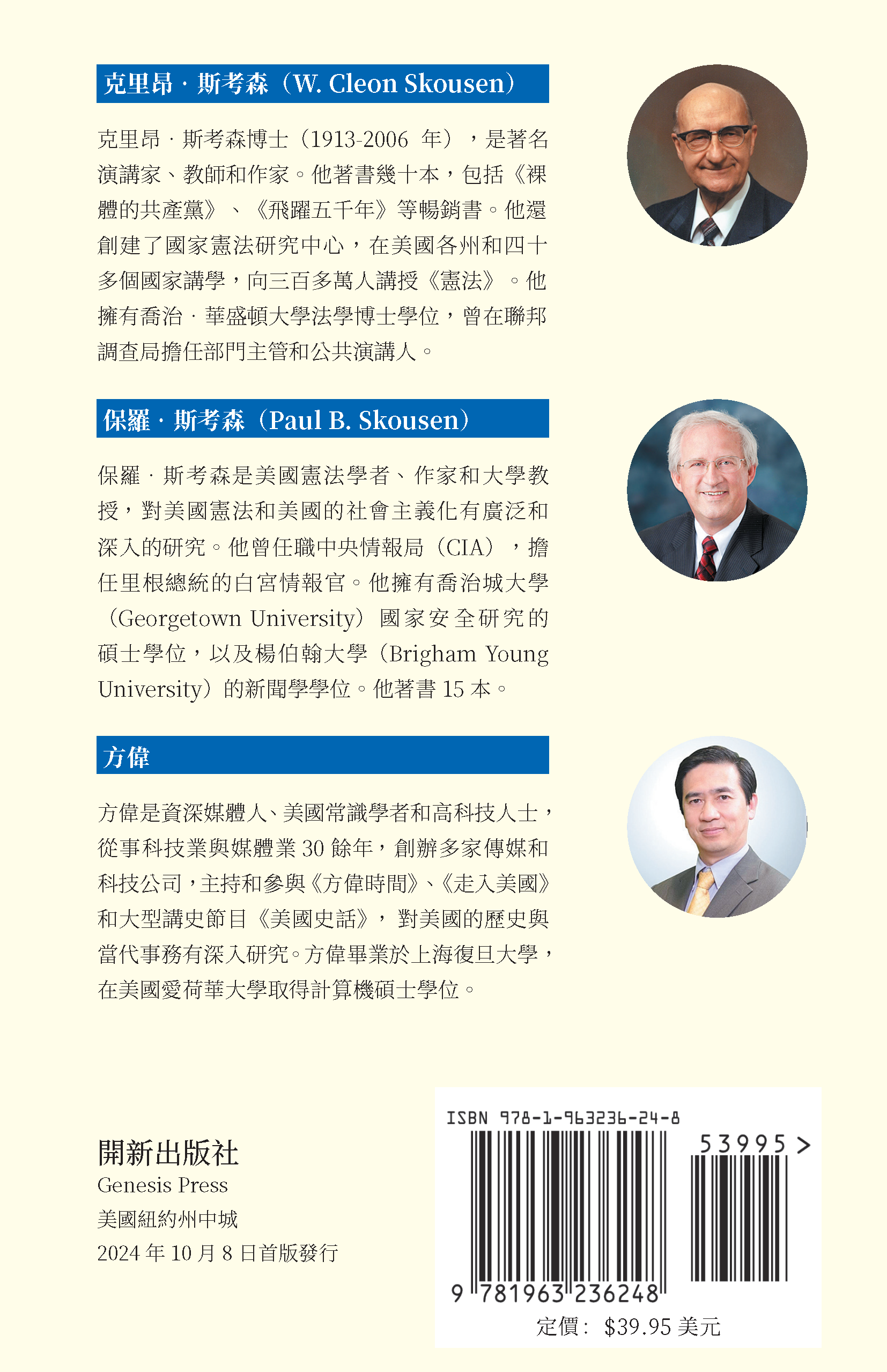 克里昂‧斯考森(Cleon Skousen)博士(1913-2006年),是著名演講家、教師和作家。他著書幾十本,包括《裸體的共產黨》、《飛躍五千年》等暢銷書。他還創建了國家憲法研究中心,在美國各州和四十多個國家講學,向三百多萬人講授《憲法》。他擁有喬治‧華盛頓大學法學博士學位,曾在聯邦調查局擔任部門主管和公共演講人。